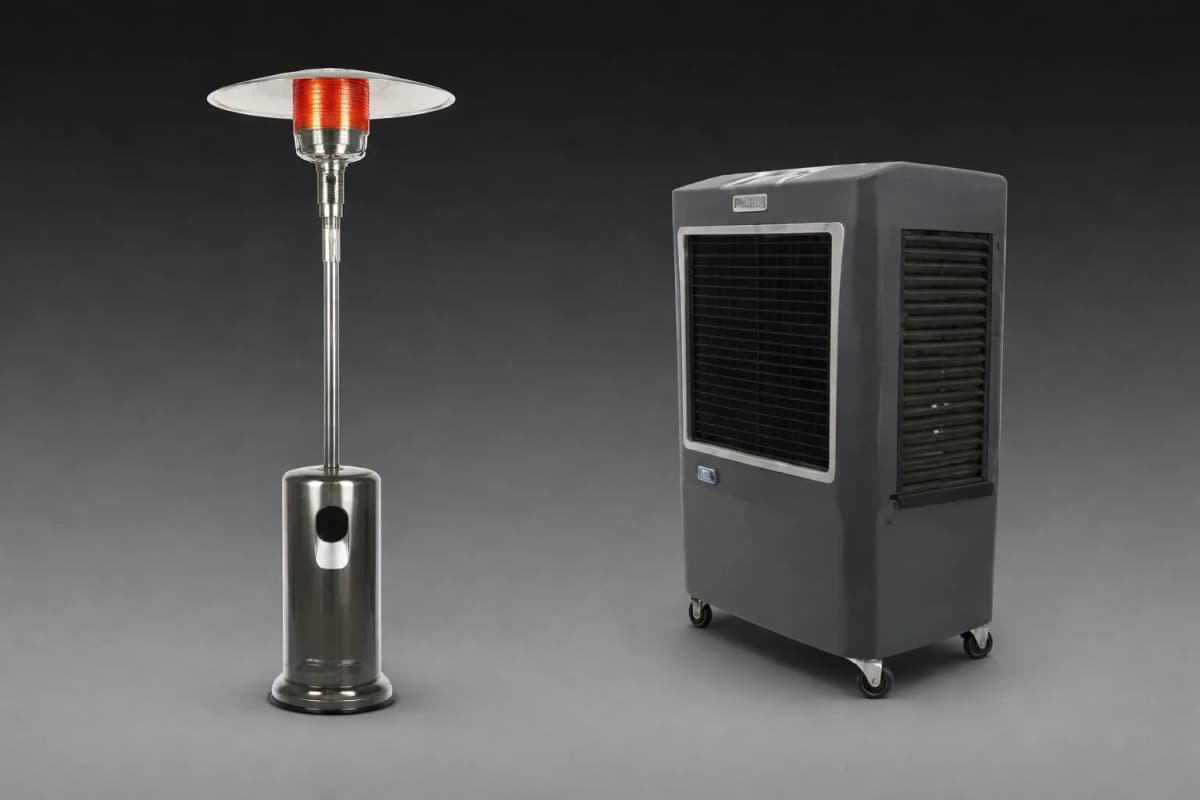 Houston weather can be unpredictable. Our outdoor heaters ($65 each) cover 200 sq ft of heating space. Our Hessaire evaporative coolers ($120) cover 950 sq ft — great for Houston's hot months. Propane gas tanks ($20) are available for heaters and cooking equipment. Contact us to plan climate control for your event.